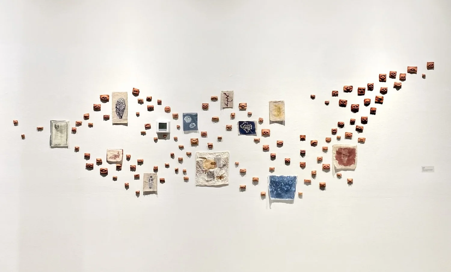 The eyes refer to those enslaved on the Wallace plantation. Their names that we know are inscribed in gold on the back of eyes. Those lost to memory are represented by blank-backed eyes. They gaze toward the viewer, holding them accountable. The cloth images are of the animals and people associated with stories of the Wallace house and the Coosa River The embroidered handkerchief is based on a photo of the artist as a young girl at the Wallace house. The cloth image on the right is of a page of Kate Henderson Wallace’s scrapbook. She pasted ephemera over her fathers working journal, in this case a poem and photo of Robert E. Lee on top of a letter. The eyes were made by the artist’s granddaughter, Caro Gottlieb. Terracotta, cotton, and solarfast (2025).