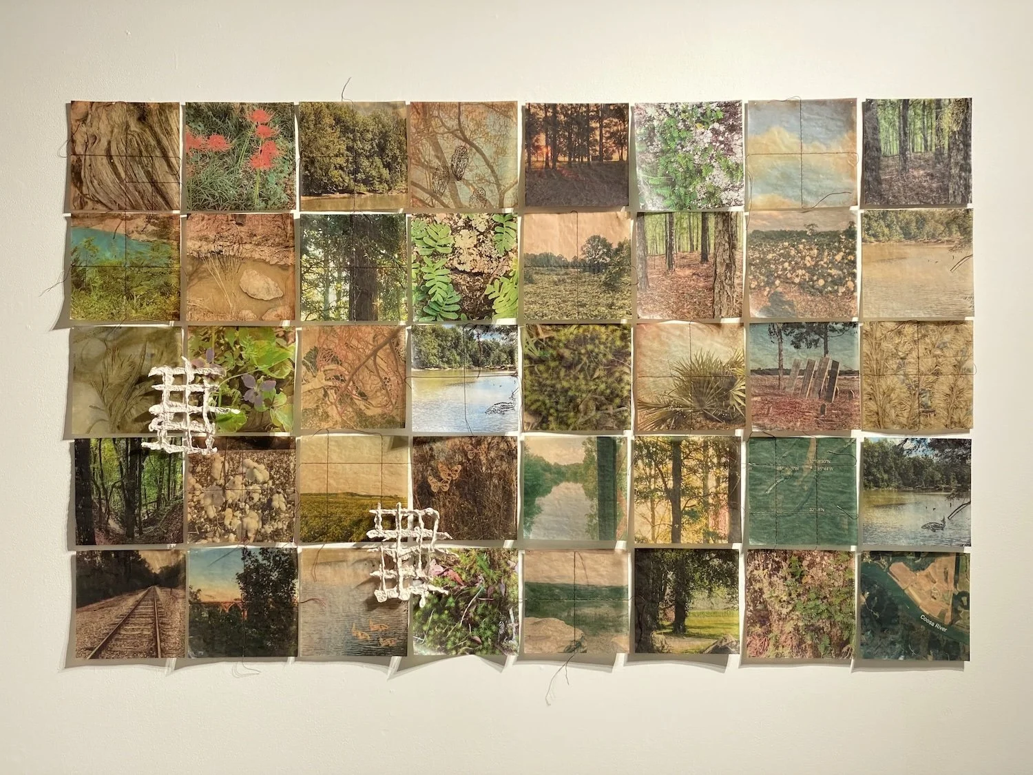 Eight inch squares, signifying surveyed quarters of land, are printed with images from the Coosa and Tallapoosa. Some are printed with owls, sturgeon, and butterflies. Some squares are further subdivided by blood-red stitching. All are finished with beeswax. Cast paper grids sit on top of this surface. Ink jet prints on tea dyed paper, acrylic relief ink, cotton embroidery floss, beeswax, paper pulp and fishline, (2025).